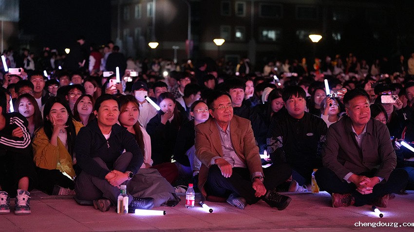 学校领导与同学们席地而坐,观看老伟德官网网站首页庆祝新中国成立75周年暨2024年迎新生文艺晚会
